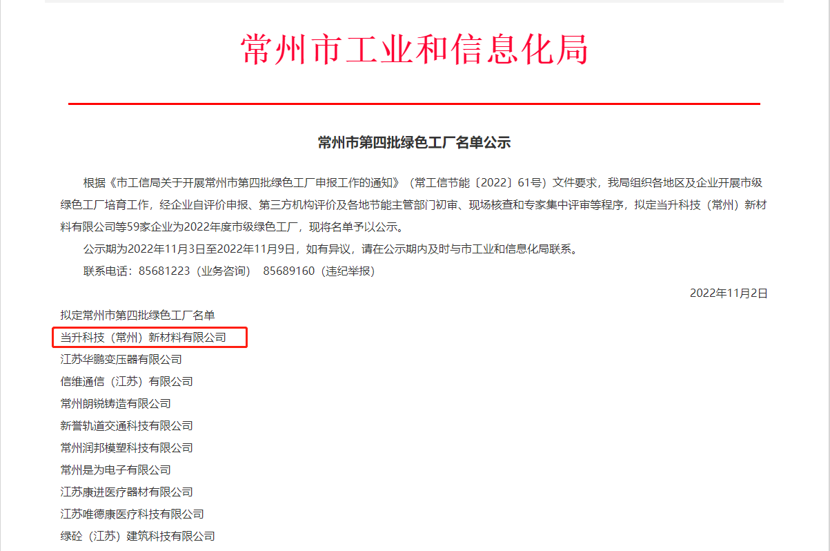 近日,常州市工業和信息局公示常州市第四批綠色工廠名單,當升科技(常州)新材料有限公司(簡稱“常州當升”)成功入選。